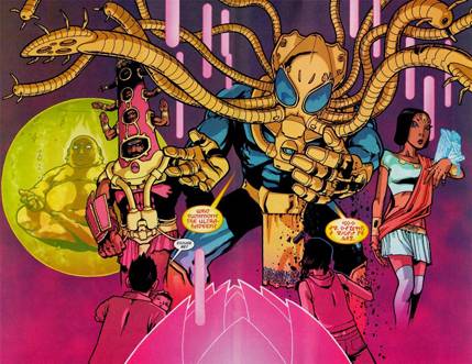 Cuando en 2004 Grant Morrison termina su paso por X-Men y vuelve a DC a hacerse cargo de los grandes personajes de la editorial, su contrato incluye además, tres miniseries para Vertigo. Las dos primeras en publicarse son Seaguy (julio-septiembre 2004) y We3 (de junio 2004 a enero 2005). Sin embargo, la primera que entregó a la editorial fue la última en salir a la venta. Sacudido por la tragedia del 9/11, Grant se puso a investigar las culturas orientales (ni chinas ni japonesas) y en algún momento- sumado a su viaje a Katmandú del ’94, súmmum del consumo de drogas- llegó a esta conclusión: “El Islam reniega del arte representacional, por lo que imaginé que, para algunos extremistas, los comics serían la forma de arte más blasfema concebible. Así que me gustó la idea de meter toda la pompa y enorme sacralidad de una de las más grandes religiones del mundo… y convertirla en un comic de Jack Kirby. Las grandes religiones tienen mucho de ciencia-ficción: seres divinos, inmensos poderes cósmicos y excusas completamente imposibles. Pienso que la religión se convertirá en una elección de estilo de vida propia de supermercado, como elegir ser un gótico o un yuppie’”. Con esta base surge la receta del plato de hoy: Vimanarama (1), publicada por Vertigo entre Abril y Junio de 2005.